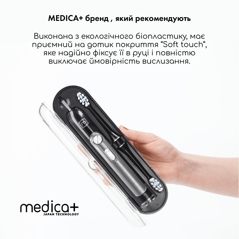 Ультразвукова зубна щітка Medica + ProBrush 9.0 виконана з екологічного біопластику, має приємне на дотик покриття, яке надійно фіксує її в руці і повністю виключає ймовірність вислизання.