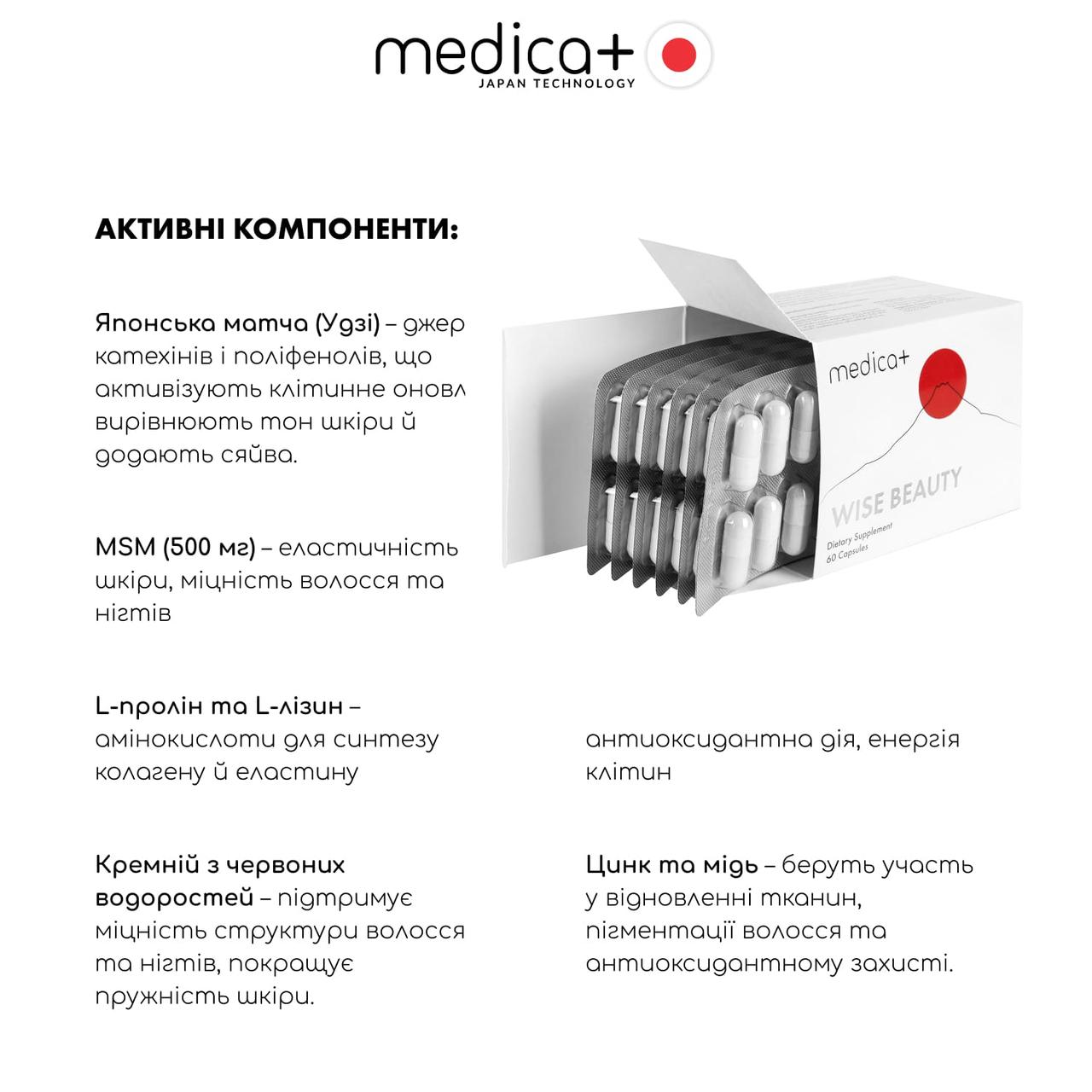 MEDICA+ Wise Beauty — функціональна дієтична добавка нового покоління для комплексної підтримки волосся, шкіри та нігтів. Формула створена на основі клінічно значущих доз МСМ, амінокислот, мікроелементів та антиоксидантів і збагачена японською матчою з регіону Удзі та кремнієм з червоних водоростей Rhodophyta.