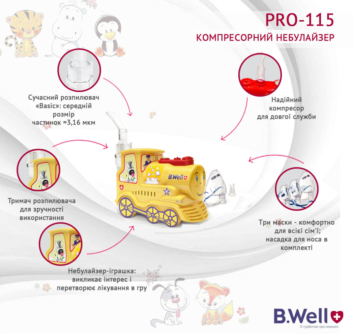 PRO-115 має дизайн у вигляді іграшки, яскравий паровозик з наклейками в комплекті сподобається дітям і зробить інгаляцію карнавал грою. Прилад має відразу три маски в комплекті – дитячу, дитячу і дорослу – це кращий небулайзер для всієї родини. А насадка для інгаляції через ніс, яка входити в комплект, дозволить використовувати небулайзер при нежиті. Завдяки держателю на корпусі приладу розпилювач можна поставити вертикально, щоб ліки не проливалося
