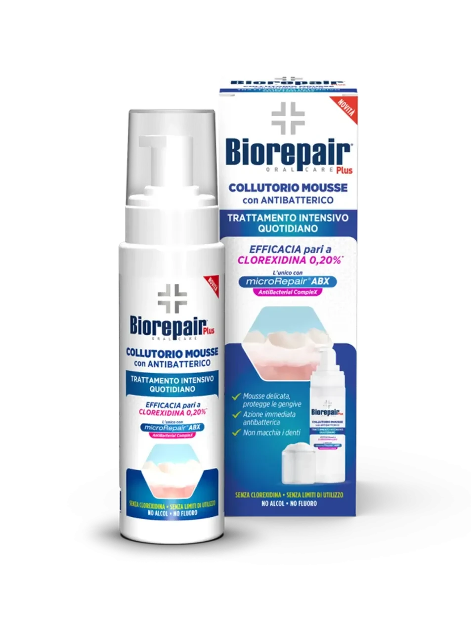 Інноваційний зубний мус Biorepair Antibatterico Intensivo з м'якою і пухнастою консистенцією делікатно обволікає ясна і допомагає протидіяти утворенню бактеріального нальоту і захищає слизову оболонку порожнини рота від запалення. Формула заснована на microrepair ABX, мікрокристалах для відновлення лаку для нігтів, збагачених спеціальним антибактеріальним комплексом, який допомагає забезпечити ефективну та негайну профілактичну та дезінтегруючу дію на бактеріальний наліт.
