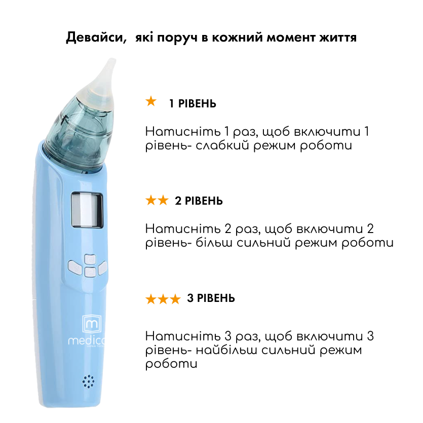 Разработчики medica + оснастили модель тремя персонализированными режимами и тремя многоразовыми насадками разного типа для детей и взрослых. (Использовать аспиратор можно взрослым и младенцам с первых дней после рождения