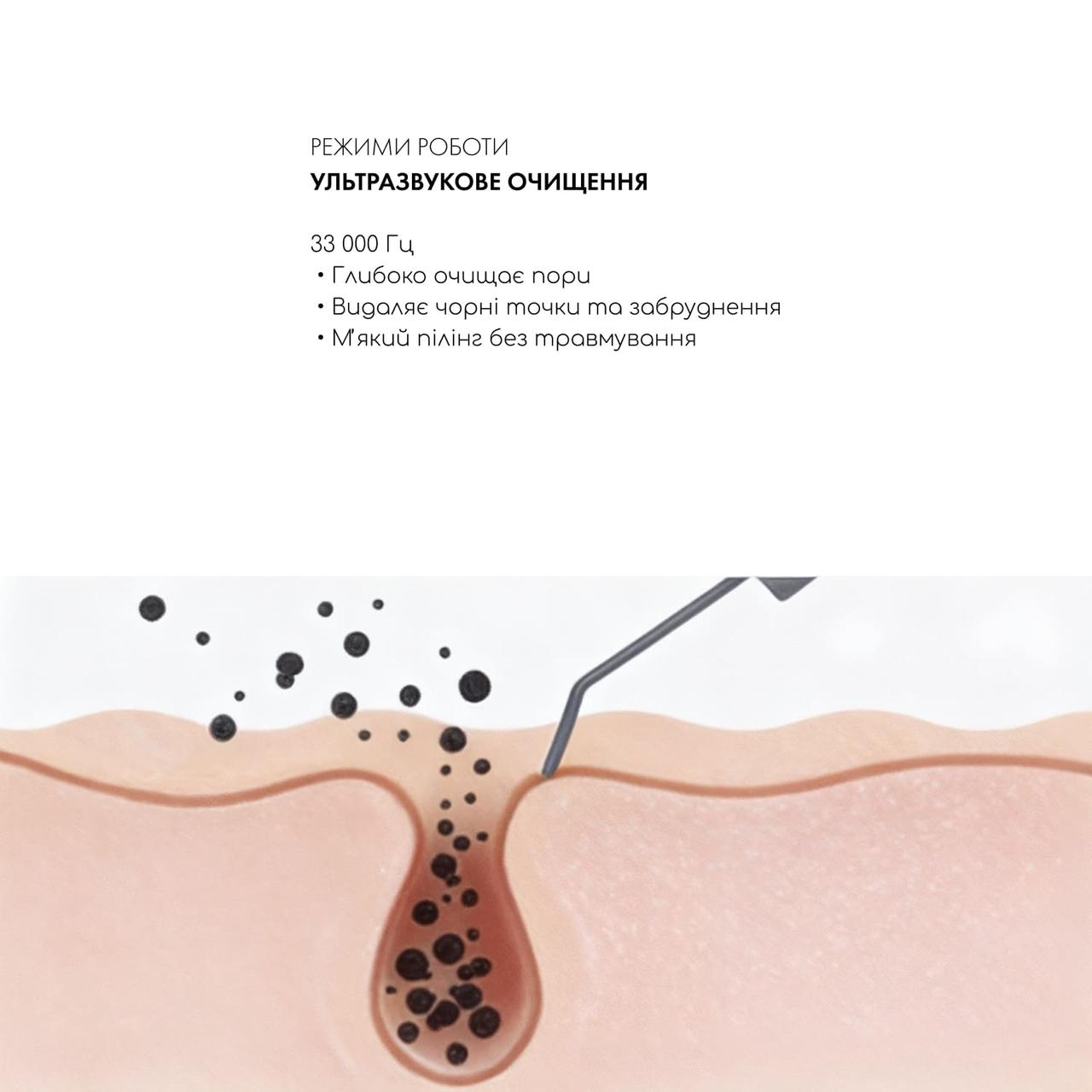 Режим очищення допомагає відкрити пори та прибрати те, що найчастіше провокує тьмяність і висипання: себум, дрібні забруднення та залишки макіяжу. Регулярне використання сприяє зменшенню чорних цяток і робить шкіру візуально більш чистою та доглянутою.