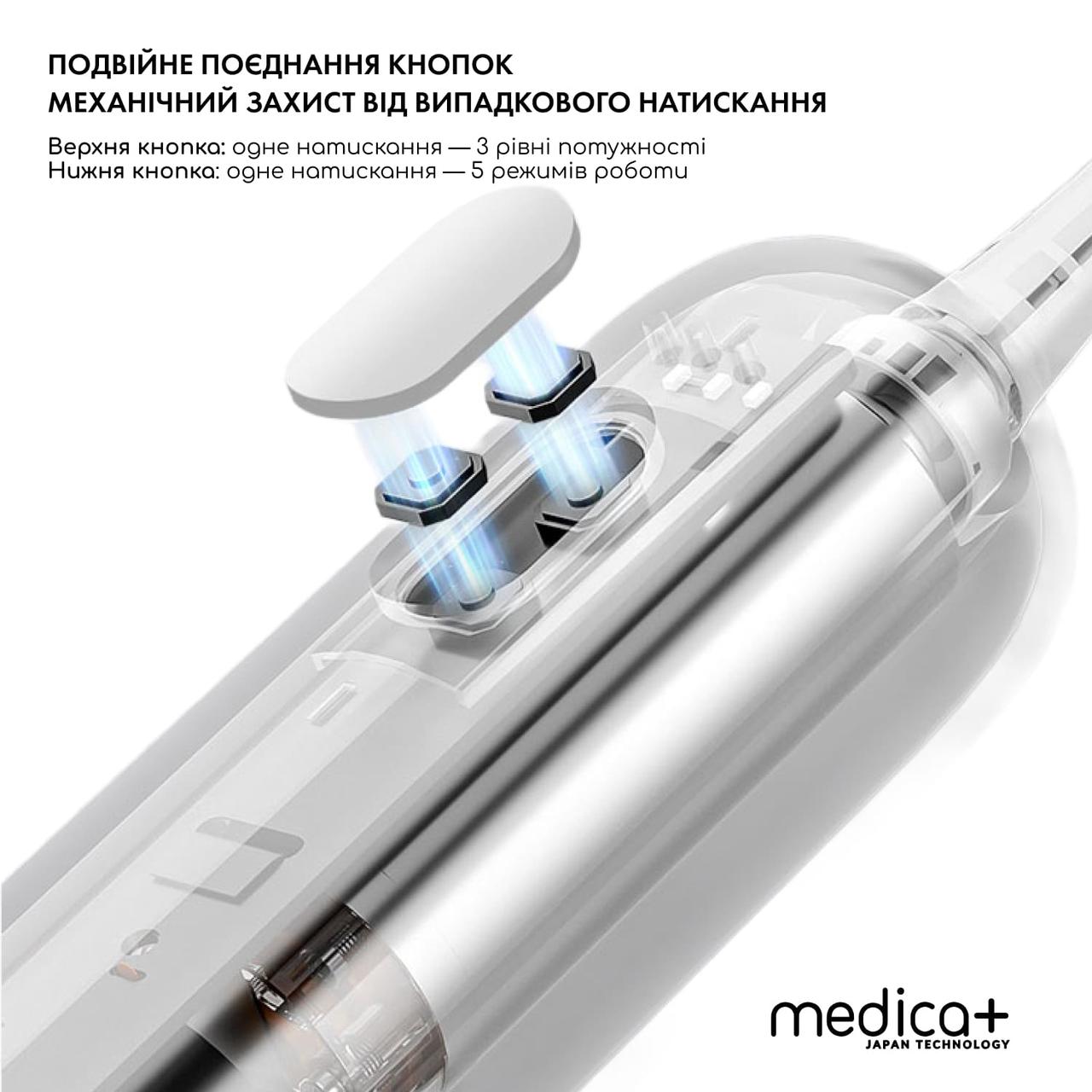 • Розумна конструкція кнопок – подвійне керування: верхня кнопка регулює 3 рівні потужності, нижня – 5 режимів роботи для різних потреб (чутливі зуби, відбілювання, масаж тощо).